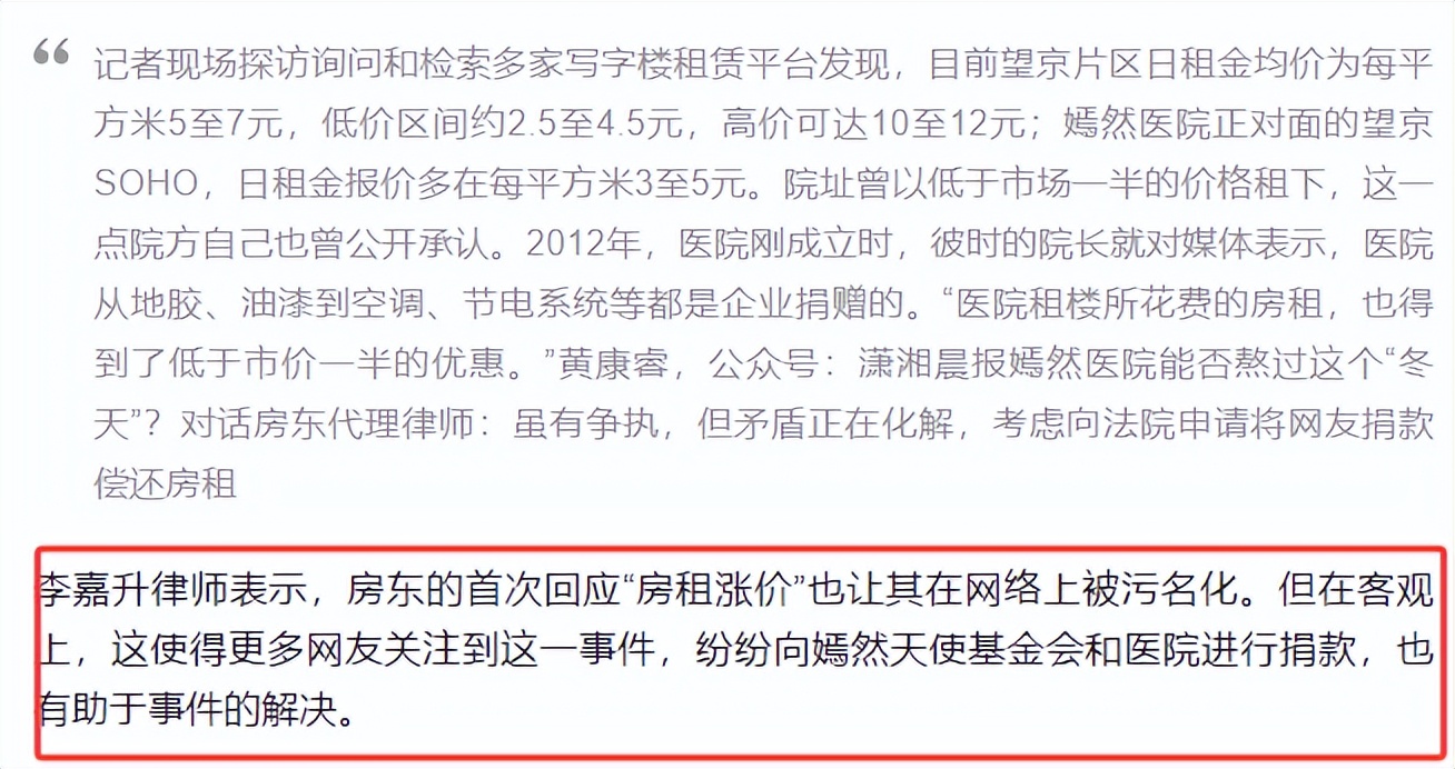 立场软化,转向依法依约:随着事件引发全网关注,大量网友捐款支持医院,舆论压力增大,房东方的态度开始出现松动。其代理律师表示,尽管房东因“涨价”说法在网络被批评,但客观上提升了事件关注度,吸引了捐款。此时,他们不再强调要求道歉,转而表示一切应以合同和法律判决为准,展现了更克制的态度。