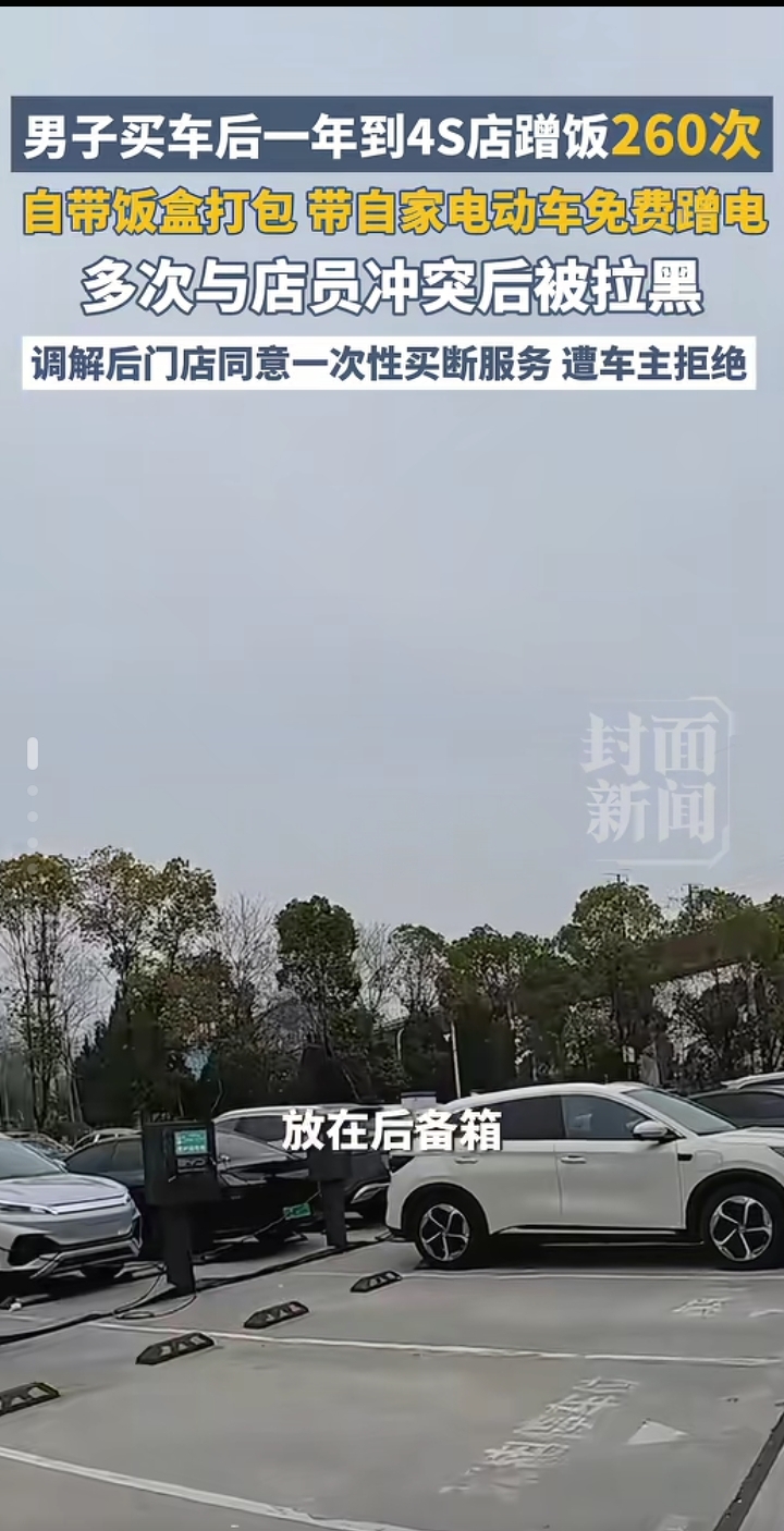 更离谱的是,他居然还把家里的电动车塞到后备箱,开到4S店的员工充电区充电。庞先生这哪是来享受车主服务的,分明是把4S店当成免费的食堂和私人充电房,主打就是一个白嫖到底。