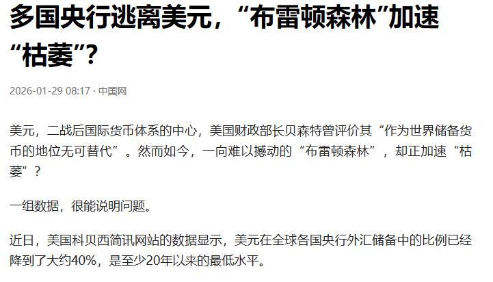 最关键的是,全球去美元化的趋势已经挡不住了。数据不会说谎:美元在全球外汇储备中的占比已经连续10多个季度低于60%,2025年第三季度跌到56.92%,创下1995年以来的最低值。更有数据显示,美元在全球储备中的份额从2020年到2026年预计下降近14个百分点,相当于各国央行总共减持了3.2万亿美元的美元资产。