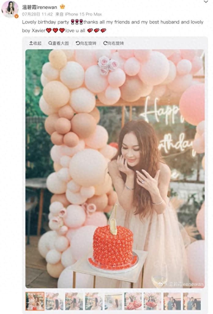 照片里她穿着粉色薄纱长裙,梳着标志性大波浪,对着蛋糕许愿的样子宛如少女。