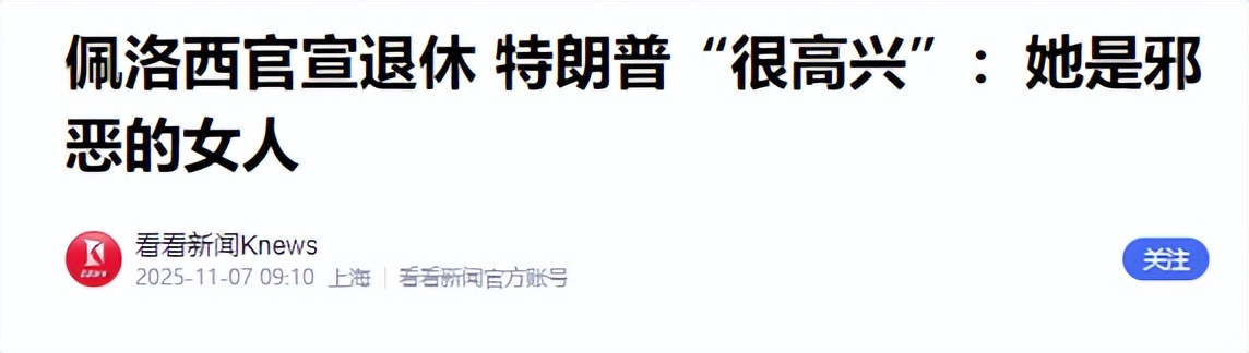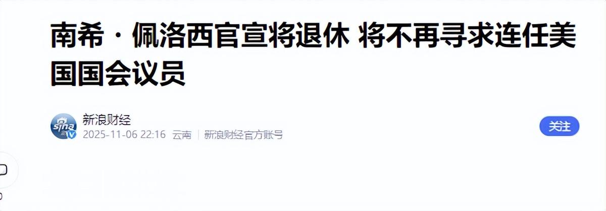已经是老对头了2025年11月,屏幕里85岁的南希·佩洛西坐姿端正,神情平静,这位曾经在某种意义上“统治”过美国立法机构数十年的女人通知世界:她的戏份杀青了。到2027年任期结束,她将彻底交出权杖,如果你仔细听,能在那平稳的声线背后,听到一个时代破碎的咔嚓声。