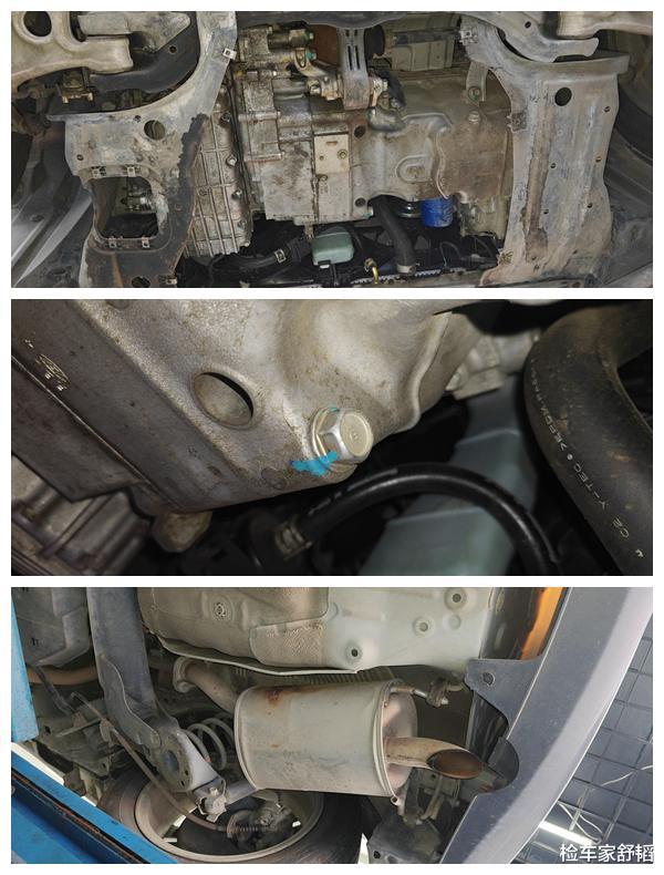 发动机下面部分同样没什么问题,各个附件基本都没拆没修没漏油,三元催化器也是好好的!唯一动过的地方是发动机和变速箱绞合连接的螺丝,变速箱维修了?