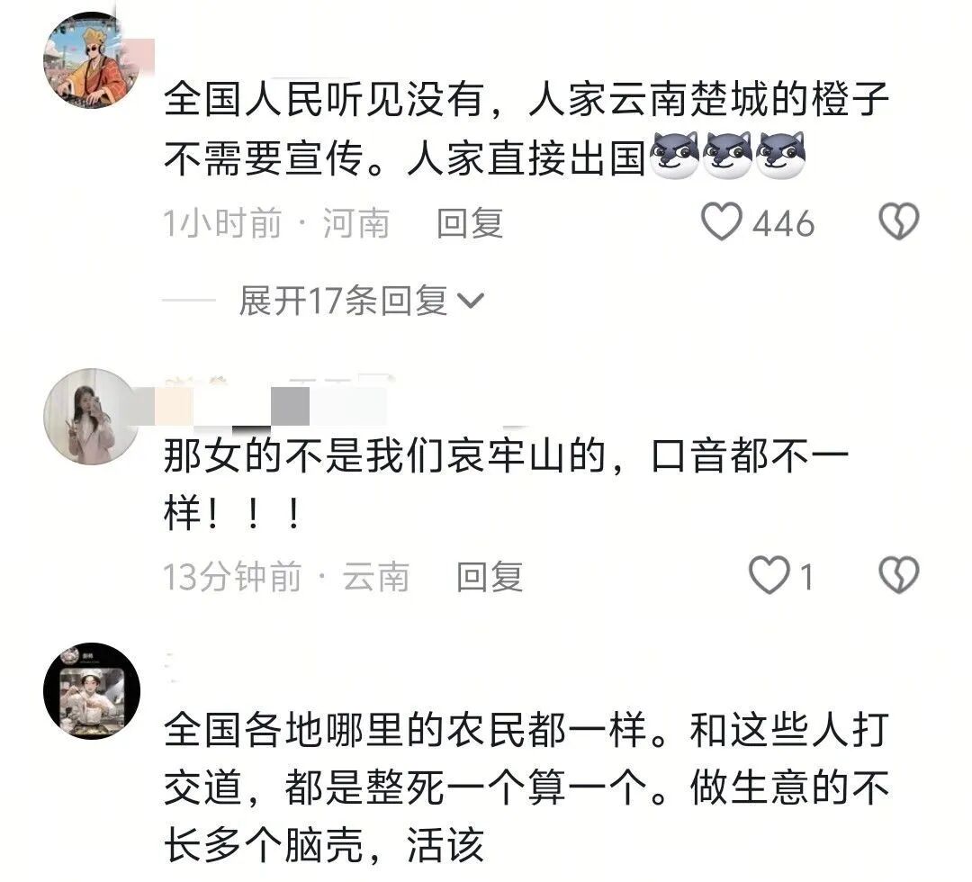 有人吐槽:“这哪是入乡随俗,分明是借着习俗耍无赖!合同写得明明白白,还能睁眼说瞎话?” 还有人联想到之前的宁夏西瓜事件 —— 当时也是个别农户掺生瓜,最后导致整个产区的西瓜滞销,“哀牢山的橙子口碑本来挺好,别让几个黑心代办给毁了!”