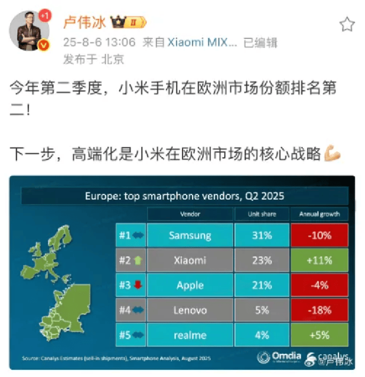 2025年8月6日,小米集团合伙人兼手机部总裁卢伟冰在微博晒出了“二季度小米手机超越苹果,成为欧洲市场份额排名第二”的劲爆消息。