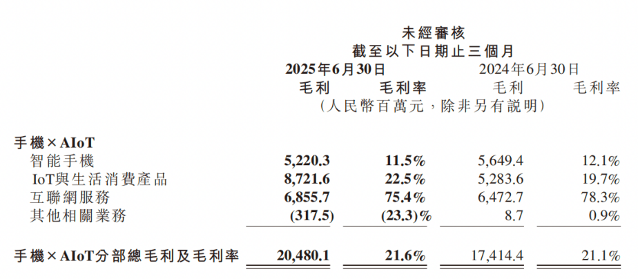 以大家电为主的IoT业务,成了小米最大的现金奶牛。但2024年第二季度还不是,彼时IoT的毛利不仅低于互联网服务,还低于智能手机。