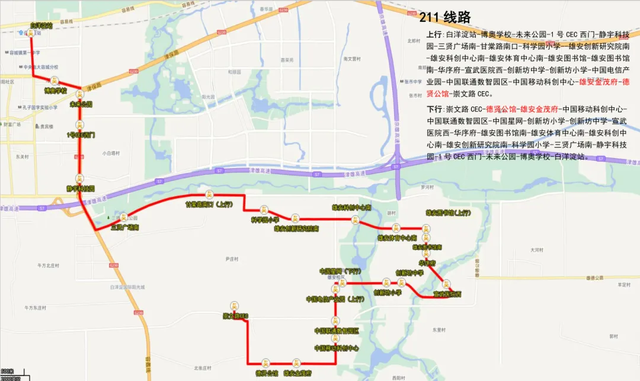 途经道路:首站从崇文路CEC出发,沿1号通道、崇文路、九河大街、渥城路、雁翎大街、锦朋路、易城东街、易城西街、崇文路、海岳大街、白洋淀大道、津海大街、豪丹路、罗萨路、益达街至白洋淀站。