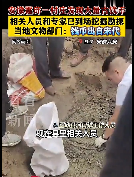 9月7日,在安徽省六安市霍邱县城南十公里的河口镇十三湾村,县文旅体育局的相关工作人员经过挖掘出土大量钱币,这些钱币出自宋代,大约三四千斤。
