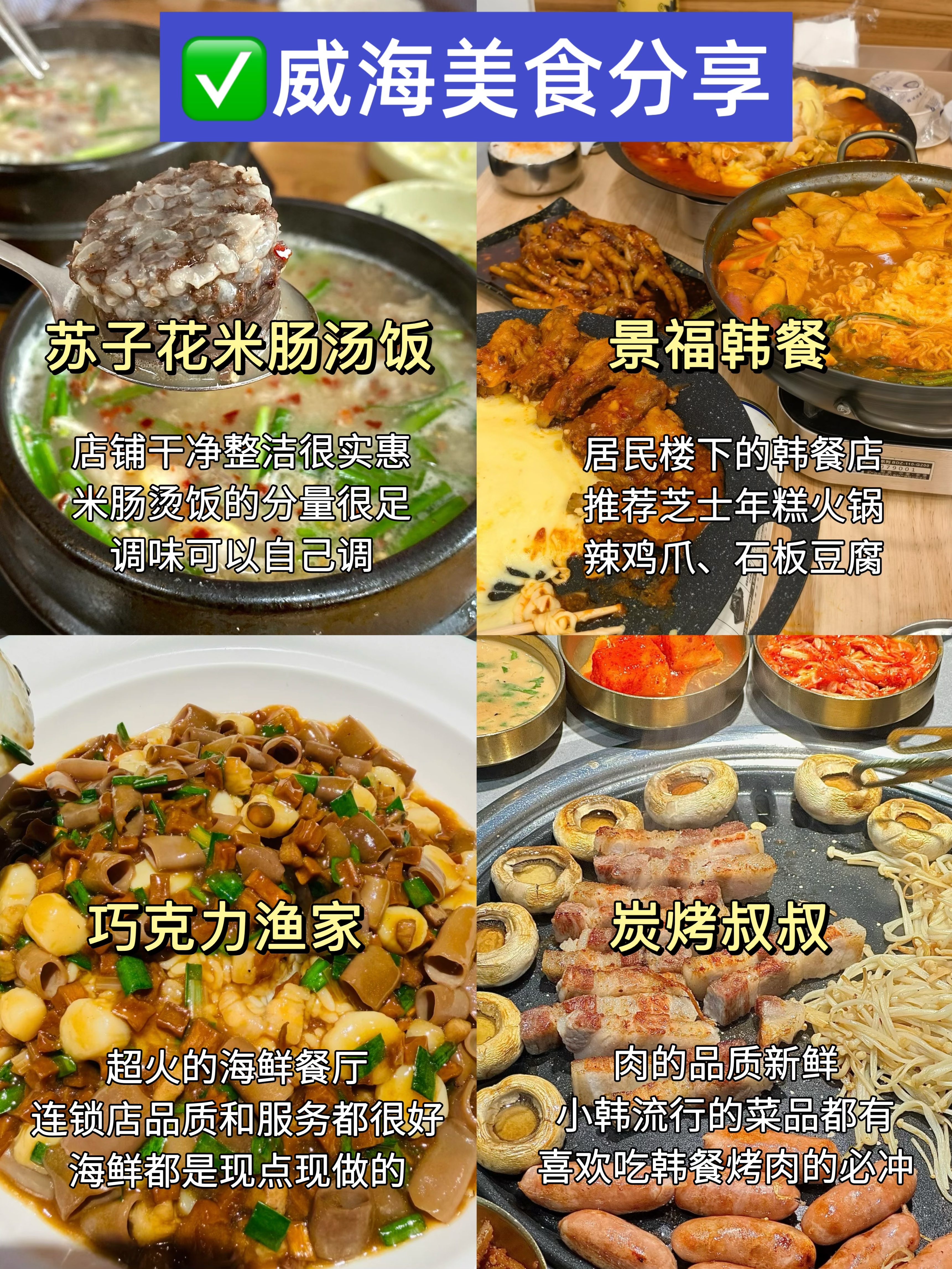 ✔️苏子花米肠汤饭(米肠第一次吃就会爱上)✔️景福韩餐(韩餐口味不错,位置不太好找)