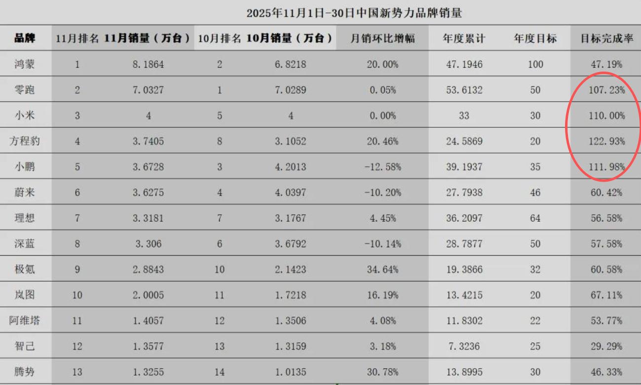但是,随着11月份的销量出炉,再结合前面1-11月份的销量,我们发现整个2025年,估计也只有4家新势力车企能够完成任务,其它的几乎都完不成了,有些车企甚至到目前都没有完成50%,可见当初的目标定的是多么的离谱。
