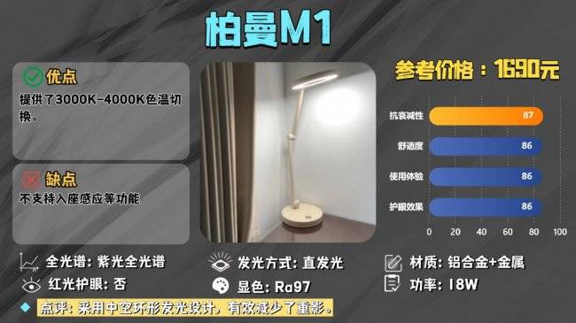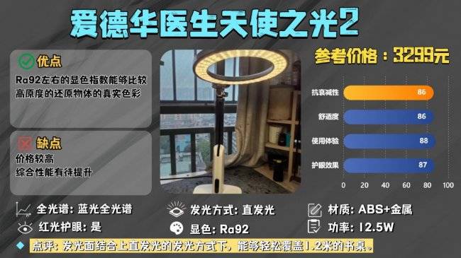 爱德华的环形发光面是其独特的特点,能够有效的减少重影,并且其发光面结合上直发光的发光方式下,能够轻松覆盖1.2米的书桌,符合个人基础照明。