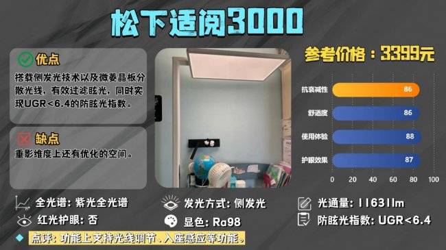 松下采用创新型发光面,搭载侧发光技术以及微菱晶板分散光线,有效过滤眩光,同时实现UGR<6.4的防眩光指数,另外其虽然上下光通量比例分布合理,但从实际体验中来看,其重影维度上还有优化的空间。