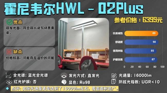 霍尼韦尔的双发光面设计是这个型号比较独特的特点,也有很多人因为这个而选择了这款护眼灯,实际双发光面能够呈现明亮且符合双人读写照明的光线,实际光通量更是达到了16000lm左右,符合AA级照明标准,同时防眩光指数在10左右,不过从实际体验中来看,光感会比较强一些。