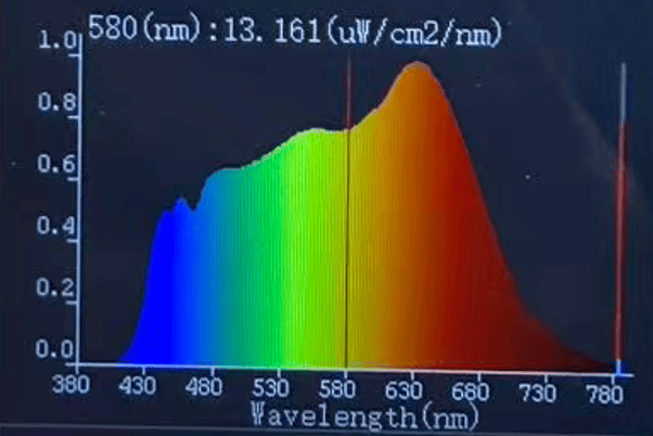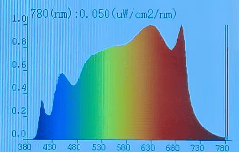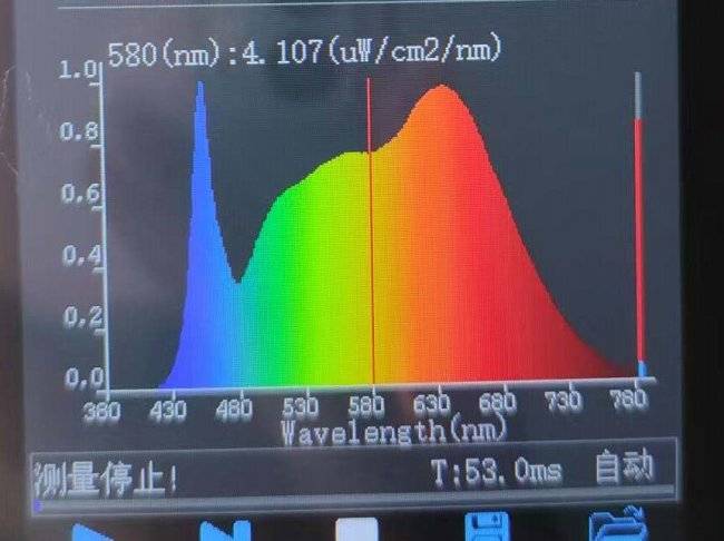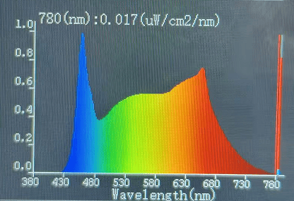 这款台灯显色指数大约在Ra97水平,内置全光谱灯珠,整体观感还算舒适,虽然采用紫光激发全光谱,但实测蓝光指标仍在0.8左右,光谱表现中规中矩。