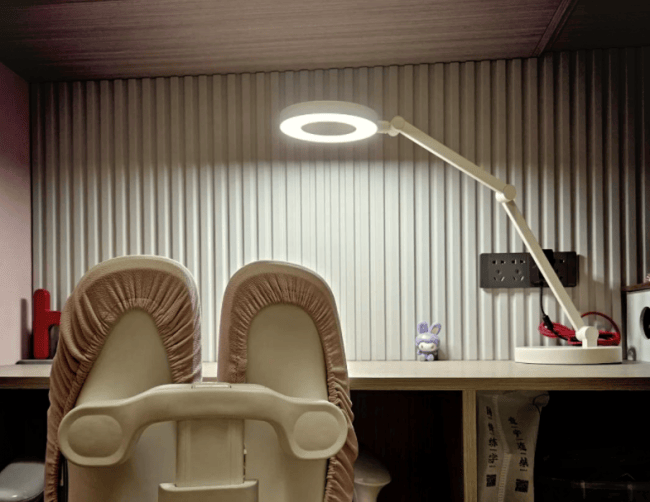 在照明结构上,这款台灯采用中空环形发光设计,可实现360°均匀铺光,明显减少头手遮挡带来的阴影,并有效压低书面眩光,轻松覆盖约1.2米书桌范围。
