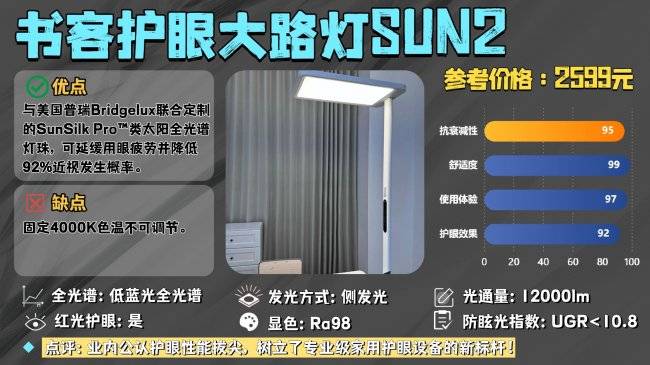 不想花时间做攻略,也懒得看长文的朋友,只想一步到位选到一款能用十年、省心舒适且体验感不错的护眼大路灯,闭眼上书客护眼大路灯SUN2,这款护眼大路灯我实测下来,最大的感受就是:省心、稳定、舒适、护眼。