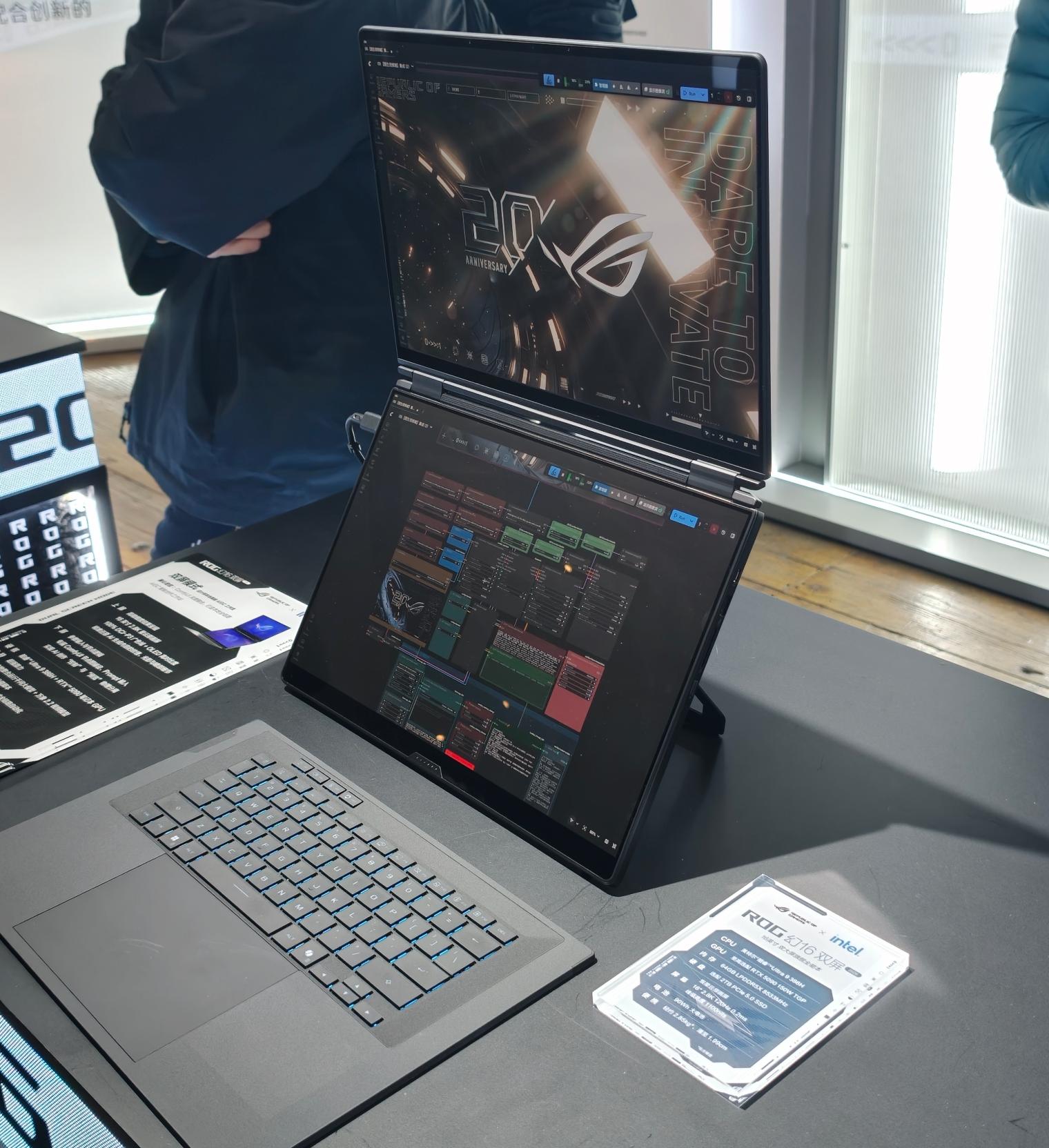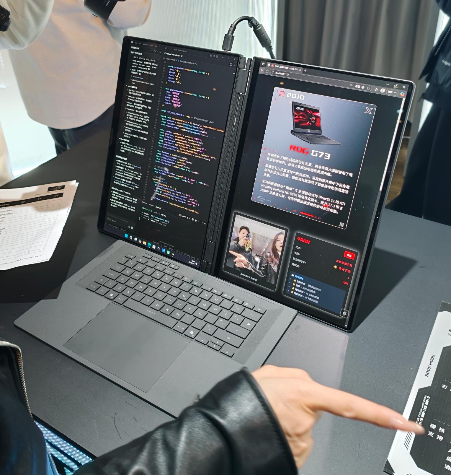 二、形态颠覆:ROG幻16双屏,五种形态解锁全场景效率如果说星云原画屏是视觉基础,那ROG幻16双屏就是本次前瞻会最具颠覆性的产品。这款16英寸双大屏旗舰,通过320°自由开合的双轴同步铰链,解锁了双屏、分享、帐篷、书本、笔记本五种使用形态,总显示面积超21英寸,完美覆盖从办公到娱乐的全场景需求。