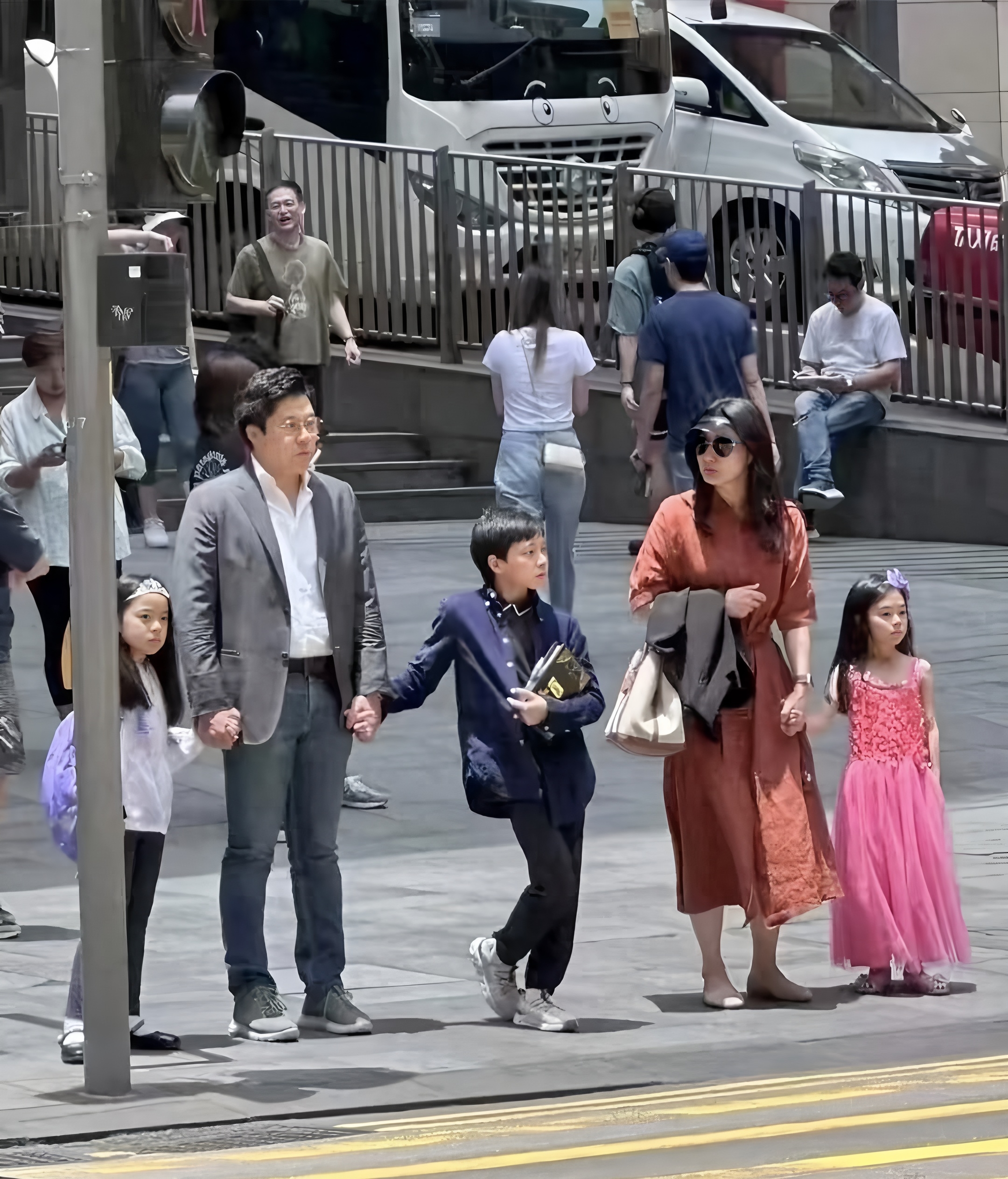 香港街头傍晚的余晖里,霍启刚白衬衫领子翘得老高,左右手各牵着一个蹦蹦跳跳的孩子。郭晶晶拎着鼓鼓的帆布包走在旁边,砖红色衬衫裙被风掀起一角,小女儿霍中怡的粉色吊带裙跟着晃成波浪。这家人等红灯的背影,像极了赶着回家吃饭的邻家五口。