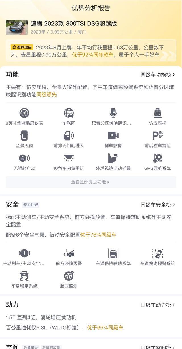 除了车况以外,速腾在配置方面同样表现突出。在主动安全性配置上,该车配置了车道偏离预警、车道保持辅助、车身稳定系统以及胎压监测等功能,可以全方位确保驾乘安全。再加上6个安全气囊,速腾的被动安全配置也在同级车中处于前列。数据显示,其被动安全配置优于97%的同级车,为购车者提供了更为可靠的保障。全速自适应巡航、仿皮座椅和全景天窗等豪华配置,为用户带来了用车体验,这在城市日常通勤或者周末出游时,能够显著提升驾驶的舒适感与便捷性。