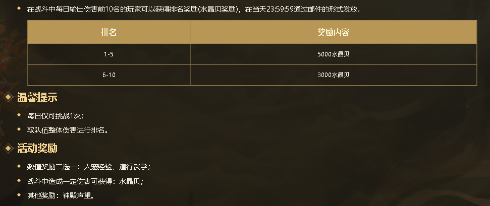 如果你在队伍中特别能C,硬带着队伍打了很多回合,那你就有机会登上输出排行榜。《问道》官方为这些玩家准备了大量奖励:前1-5名的可以获得5K水晶贝;6-10名则可获得3K水晶贝,这份奖励也是相当不错了。