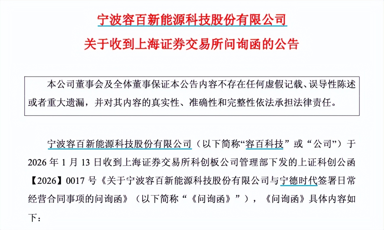 据容百科技公告,1月13日,其收到上海证券交易所科创板公司管理部下发的问询函,要求补充披露公司在与宁德时代的合作中具备相应履约能力的更多依据,并全面提示包括原材料价格波动在内的各项风险。