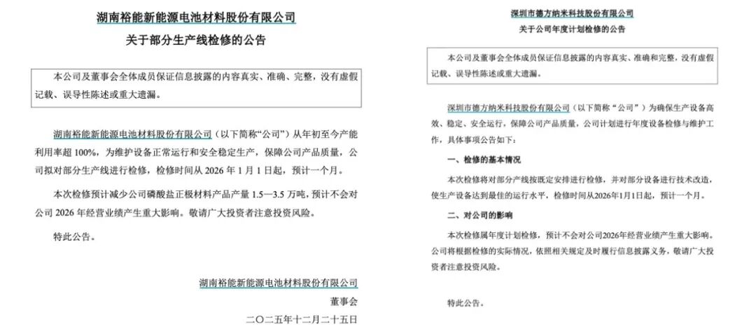 从2025年12月开始,万润新能、湖南裕能、德方纳米、安达科技、龙蟠科技等业务涉及磷酸铁锂电池原材料供应的企业先后发布产线检修计划,纷纷在2026年1月实施停产减产。