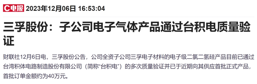 台积电供应商:公司在2023年开始已向台积电正式供应首批电子级二氯二氢硅。将受益于台积电资本开支大幅增加带来的增量。