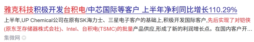 台积电供应商:全资子公司韩国UP Chemical先后实现了对铠侠、Intel、台积电的批量产品供应。将受益于台积电资本开支大幅增加带来的增量。