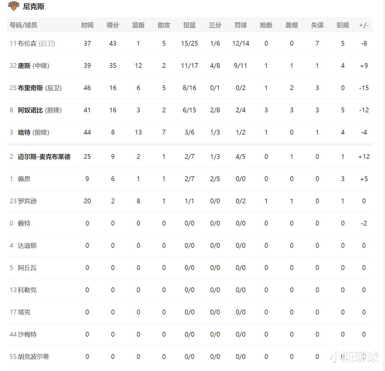 末节,布伦森连续得分,但麦康奈尔造成了他的个人第五犯,阿奴诺比连拿5分,比分来到92-99,步行者被迫叫出暂停。暂停回来麦克布莱德、唐斯分别造成步行者三分犯规,步行者连续投篮不中,唐斯、阿奴诺比篮下得分直接帮助尼克斯起势,尼克斯108-92领先。但此时风云突变,最后七分钟尼克斯还领先15分之多,但步行者没有放弃,内史密斯爆发投进6中6的三分球强行挽回比赛悬念,最后时刻阿奴诺比两罚一中留给步行者一线生机,关键时刻哈利伯顿再现magic,投中一记踩线三分球颠进篮筐,将比赛拖入加时!