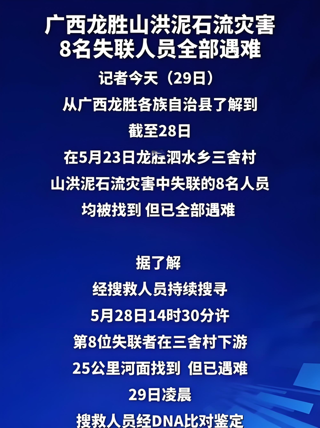 在广西龙胜各族自治县应急管理部门获悉,经过连续6天的紧张搜救,5月23日发生在泗水乡三舍村的山洪泥石流灾害失联人员已全部找到,但不幸的是,8名失联者均确认遇难。