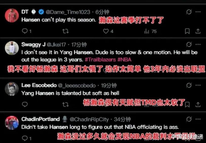 杨瀚森在NBA季前赛首秀中只得到了4分4个篮板1次助攻,而且出现了4次失误和6次犯规,表现有些糟糕。从比赛的情况来看,杨瀚森暴露出了很多问题,比如对抗太差、速度太慢、护框卡位问题明显、体能跟不上等等。对于杨瀚森的表现,不少国内球迷和美国球迷都有些失望。国内媒体和球迷还好说,只是希望杨瀚森能够认识到自己的不足,在接下来的训练中提升自己。但美国球迷对杨瀚森的评价就没有这么委婉了,直言杨瀚森又软又慢,甚至表示他会在三年内淡出NBA。