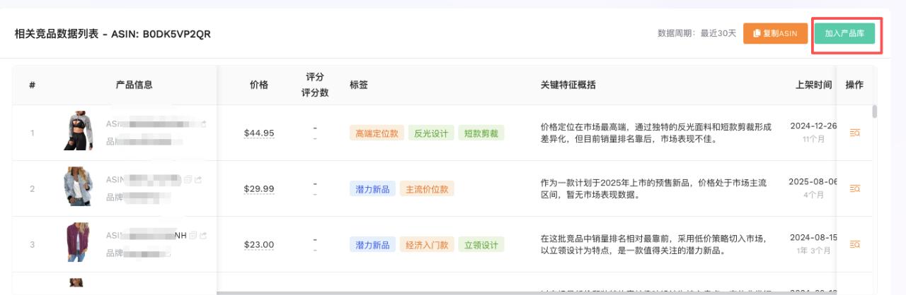 1)在相关竞品数据列表界面点击”加入产品库“:
