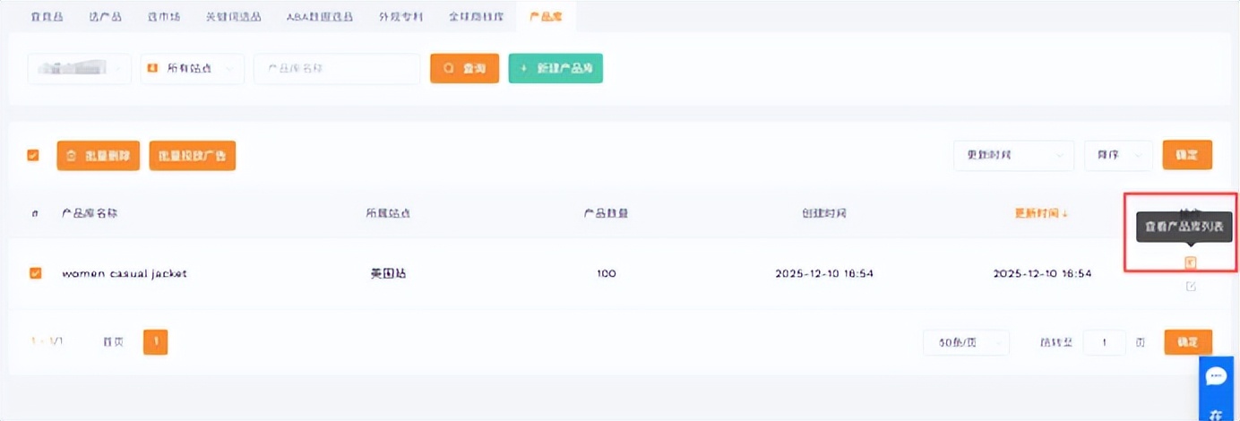 3)在卖家精灵工具栏里找到”产品库“,点击查看产品库列表: