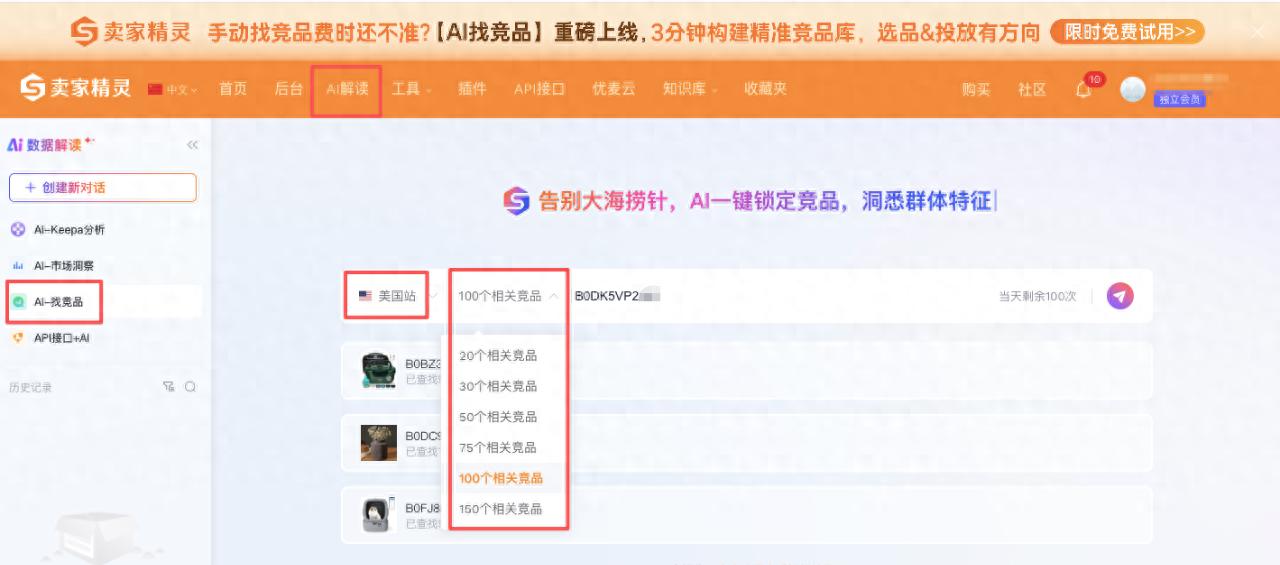 可以利用卖家精灵工具栏里的”AI解读“中的AI-找竞品功能。