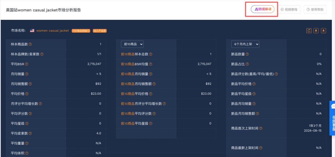 5)点击AI数据解读,就可以生成一份非常详细的该产品的市场分析报告。