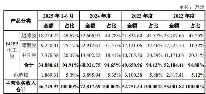 业绩起伏背后,是公司对单一业务的重度依赖。报告期内,公司主营业务收入中BOPP电工膜占比持续超过94%,其他业务(再造粒业务)占比不足6%,尚未形成第二增长曲线。2025年上半年,这一比例进一步升至94.91%。