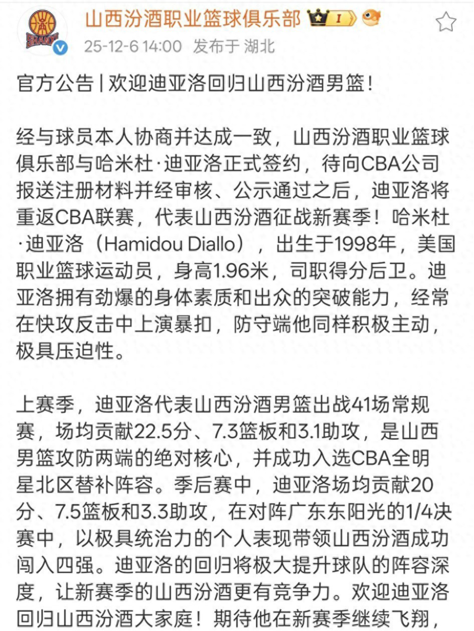 山西汾酒男篮正式官宣:迪亚洛与山西汾酒男篮签约,并即将回归山西汾酒男篮!球迷传说的绘声绘色,不如球队一声告白天下!拥有劲爆的身体素质、防守端极具压迫性、比赛中以极统治力、有出众的突破能力、快攻屡屡上演暴扣,等等。