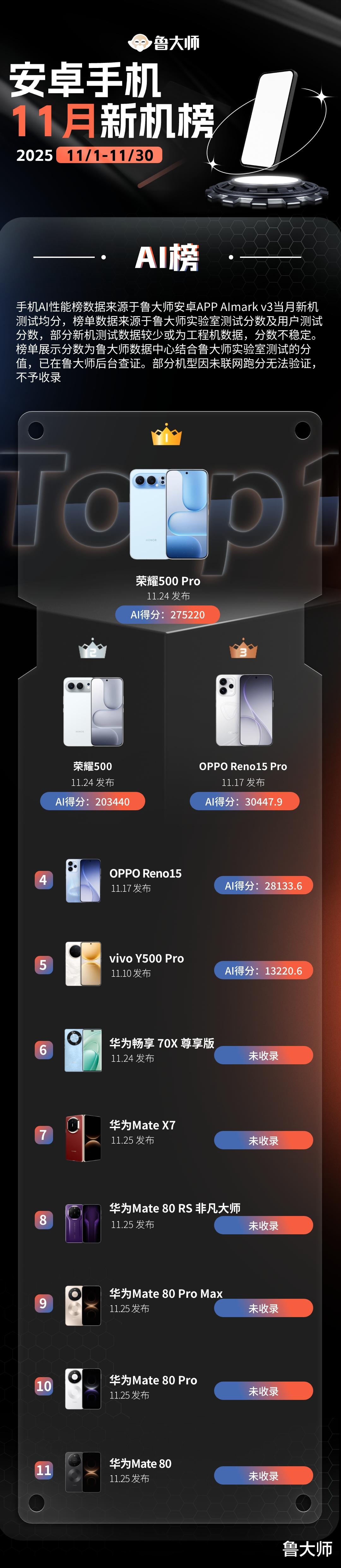 11月,荣耀500 Pro凭借均衡的配置和优化在性能、AI榜表现出色;OPPO Reno15系列则依靠ColorOS的深度优化在流畅榜上独占鳌头;华为新Mate上市带来了更多变数,尤其是麒麟芯片的AI能力令人期待。