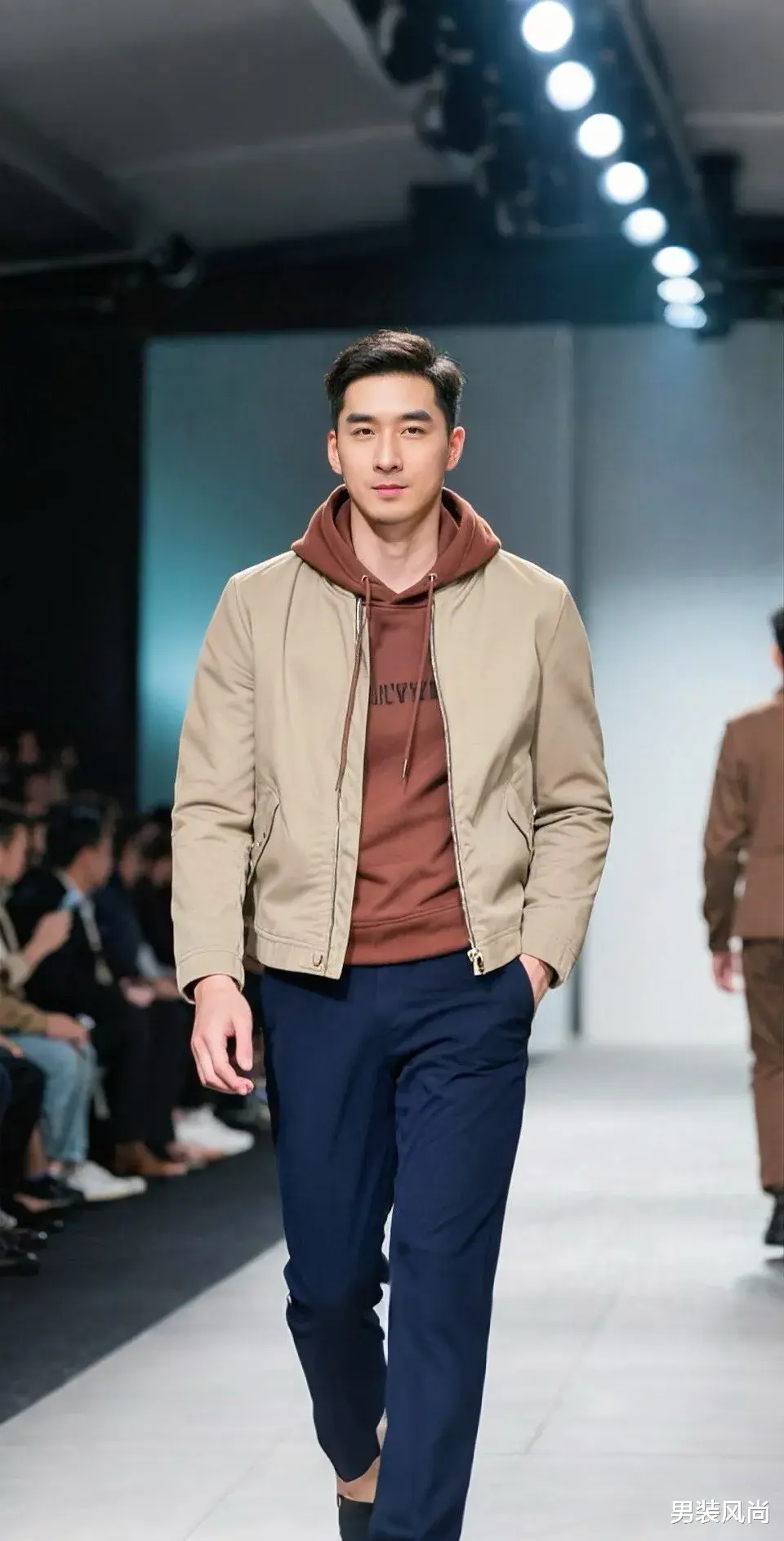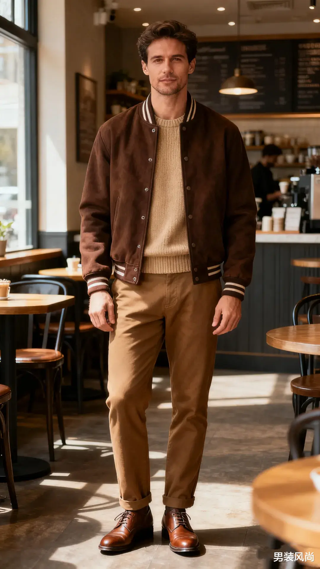 • 示例2:棕色棒球服(深棕)+ 米色内搭(浅棕)+ 卡其色裤装(中棕)+ 棕色鞋子,全棕色系的搭配充满复古温暖的感觉,适合秋冬的氛围感,尤其适合肤色偏暖的男士。