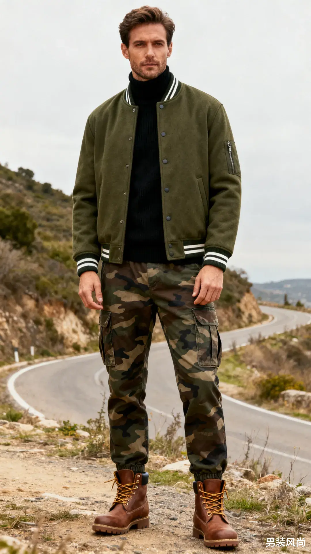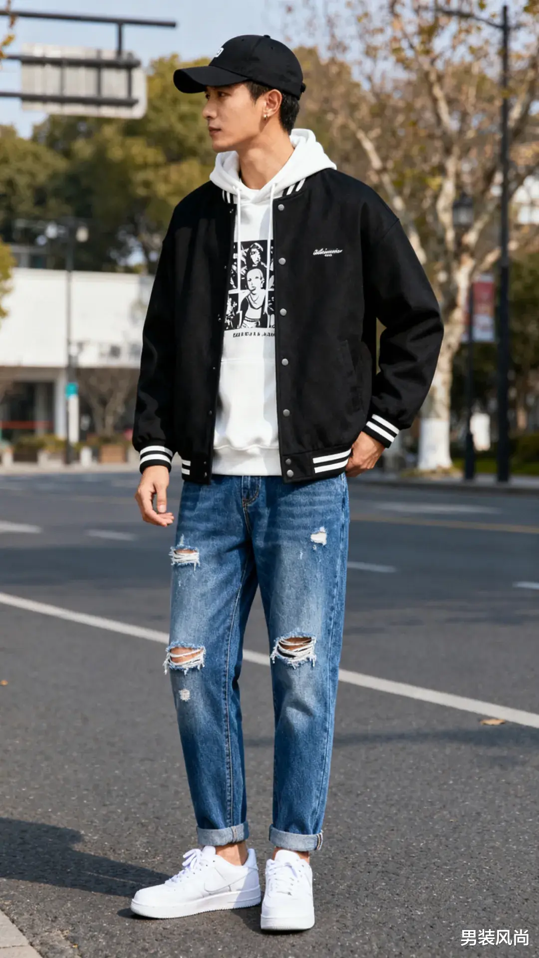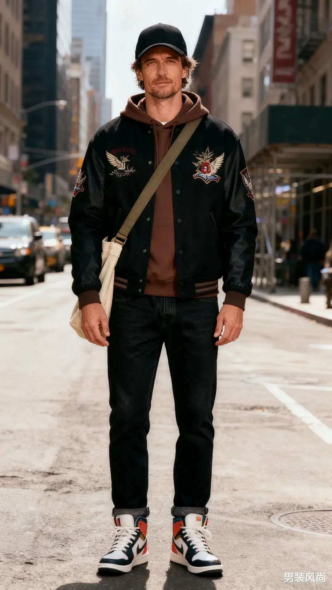 • 内搭:选择基础款白色或黑色圆领卫衣,若想增加层次感,可叠穿一件条纹长袖T恤,袖口露出1-2cm条纹边,细节感立刻拉满。• 裤装:首选直筒工装裤或水洗牛仔裤,裤脚微微盖住鞋面即可,避免过于紧身;若想更具个性,可尝试做旧牛仔阔腿裤,搭配棒球服的复古感刚刚好。• 鞋子:经典白色板鞋或黑色帆布鞋是标配,鞋底带一点点厚底设计,还能悄悄增高;若天气较冷,加一双中筒袜子,颜色与棒球服的刺绣色呼应,整体更协调。• 配饰:戴一顶黑色棒球帽(帽檐微微向下),再挎一个帆布斜挎包,潮酷感直接拉满,适合年轻男士日常出街、和朋友聚会。2. 休闲风:舒适不随意,日常通勤首选休闲风主打“自在又得体”,适合大多数日常场景,无论是上班通勤(非严格商务场合)还是周末逛超市、喝咖啡,都能穿得舒服又不邋遢。