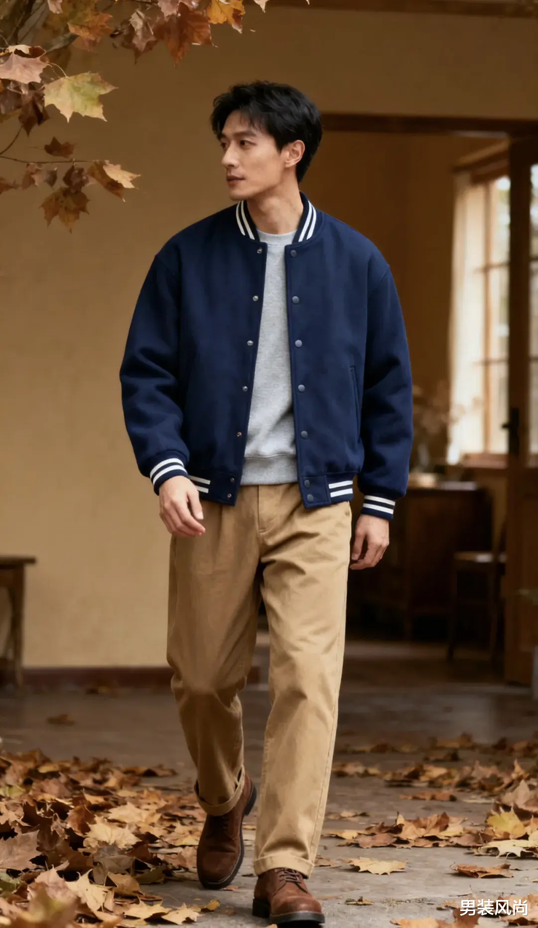 • 示例2:藏蓝色棒球服(主色)+ 浅灰色内搭 + 卡其色裤装 + 棕色鞋子,藏蓝与卡其的组合自带复古感,浅灰色作为过渡,避免颜色冲突,适合秋冬的氛围感。