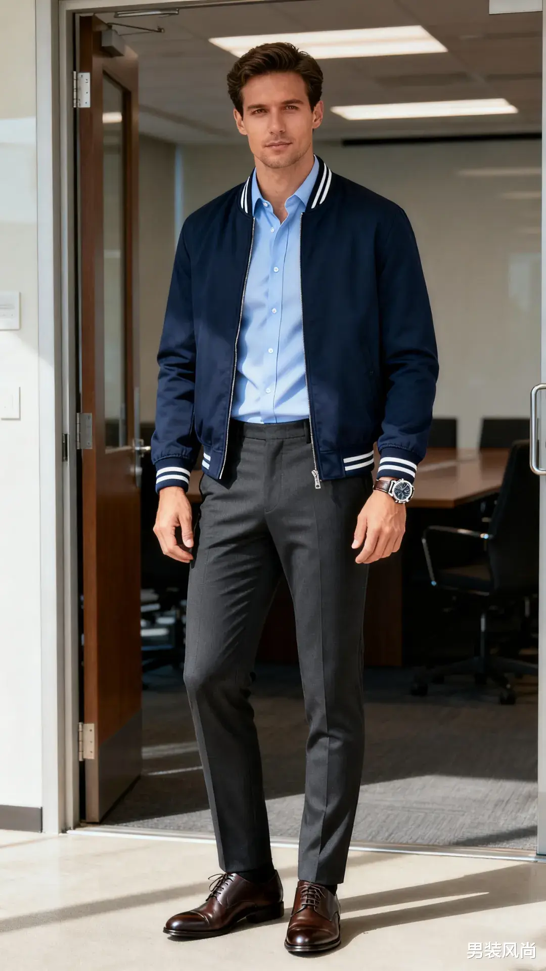 三、场景适配:看场合穿对衣,避免尴尬棒球服虽然百搭,但不同场合的搭配细节仍需调整,才能既符合场景需求,又不失时尚感。1. 日常通勤:舒适为主,兼顾得体如果公司没有严格的着装要求,休闲风或轻商务风的棒球服搭配最适合。内搭选衬衫或针织衫,裤装选休闲裤或西裤,鞋子选乐福鞋或德比鞋,既能应对办公室的工作氛围,又比传统西装更舒适。