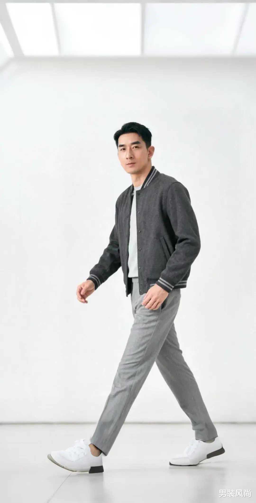 3. 同色系搭配:显质感,高级感拉满同色系搭配指选择同一颜色的不同深浅度进行组合,比如深灰+浅灰、深棕+浅棕,这种搭配方式能让整体造型更统一,显质感的同时又不会单调。• 示例1:深灰色棒球服 + 浅灰色内搭 + 中灰色裤装 + 黑色鞋子,不同灰度的组合层次分明,再用灰白色鞋子增加对比,避免过于沉闷。
