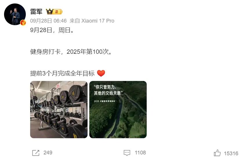 雷军之前因发福被网友吐槽 “给母校丢脸”。后来硬生生靠健身逆袭,练出了清晰下颌线,并 立下 “全年健身 100 次” 的 flag,还提前完成了。
