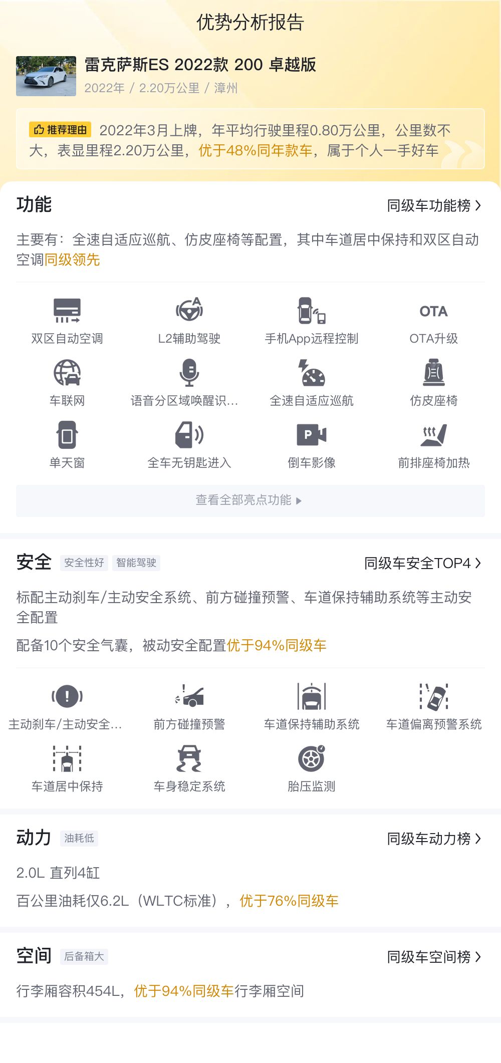 而今天要说的这辆雷克萨斯ES 2022款 200 卓越版,是在2022年3月于美丽的漳州上牌。该车采用汽油作为能源类型,符合国VI排放标准,是一款前驱车型。至今已经行驶了2.2万公里,且未曾有过过户记录。目前,这辆车的售价为20.98万元,相比其新车指导价29.69万元,具有相当的性价比。