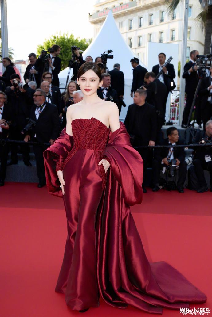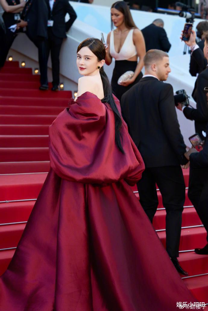 赵樱子这件红色抹胸礼服就是之前她网上求助被泼了咖啡的那件,当时还被质疑是学吉克隽逸在线求助粉底液的梗,故意耍的小把戏,毕竟参加这种活动都会有备选礼服。昨天赵樱子的碎钻裙相当惊艳,今天还是选择了这件礼服看来对于这很是钟情,不过效果真的蛮有吸引力的。这颜色太鲜亮了,再加上后面的大拖尾,非常的有气场。