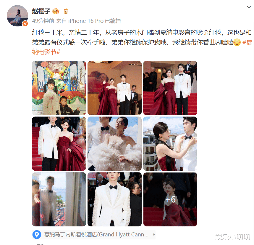 5月15日,赵樱子再次在个人社交平台分享了戛纳红毯,不过与昨天不同的是今天赵樱子居然带着自己的亲弟弟走上了戛纳红毯。赵樱子发文称:红毯三十米,亲情二十年,从老房子的木门槛到戛纳电影宫的鎏金红毯,这也是和弟弟最有仪式感一次牵手啦,弟弟你继续保护我哦,我继续带你看世界嘻嘻。