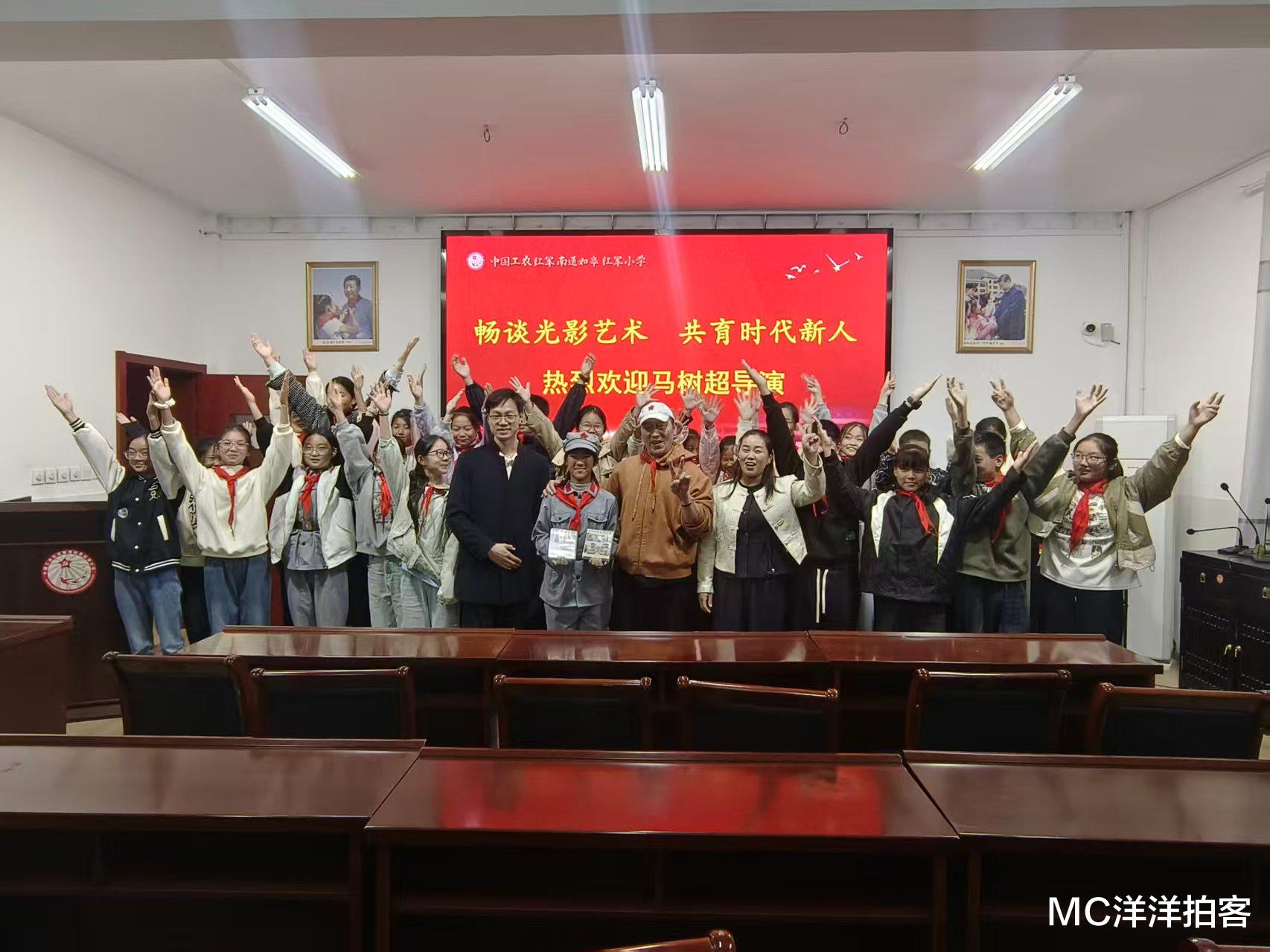 在红军小学校长严峰陪同下,马树超参观了校园红色文化长廊、学校历史展厅,并亲自体验了书香浓郁的图书馆和活力四射的学校操场等。严校长详细介绍了学校“传承红军精神,培育时代新人”的办学特色与育人成果等。马树超对学校将红色基因融入日常教学的做法高度赞赏,称“校园里处处彰显着立德树人的初心”。随后,马树超结合自身创作经历,动情讲述了电影《建国大业》、《非常岁月》等作品背后的历史故事与英雄事迹。他以质朴的语言、深邃的思考,引导学生理解“红色基因”的时代内涵,并鼓励孩子们“珍惜当下,勤学笃行,将来为祖国建设贡献力量”。