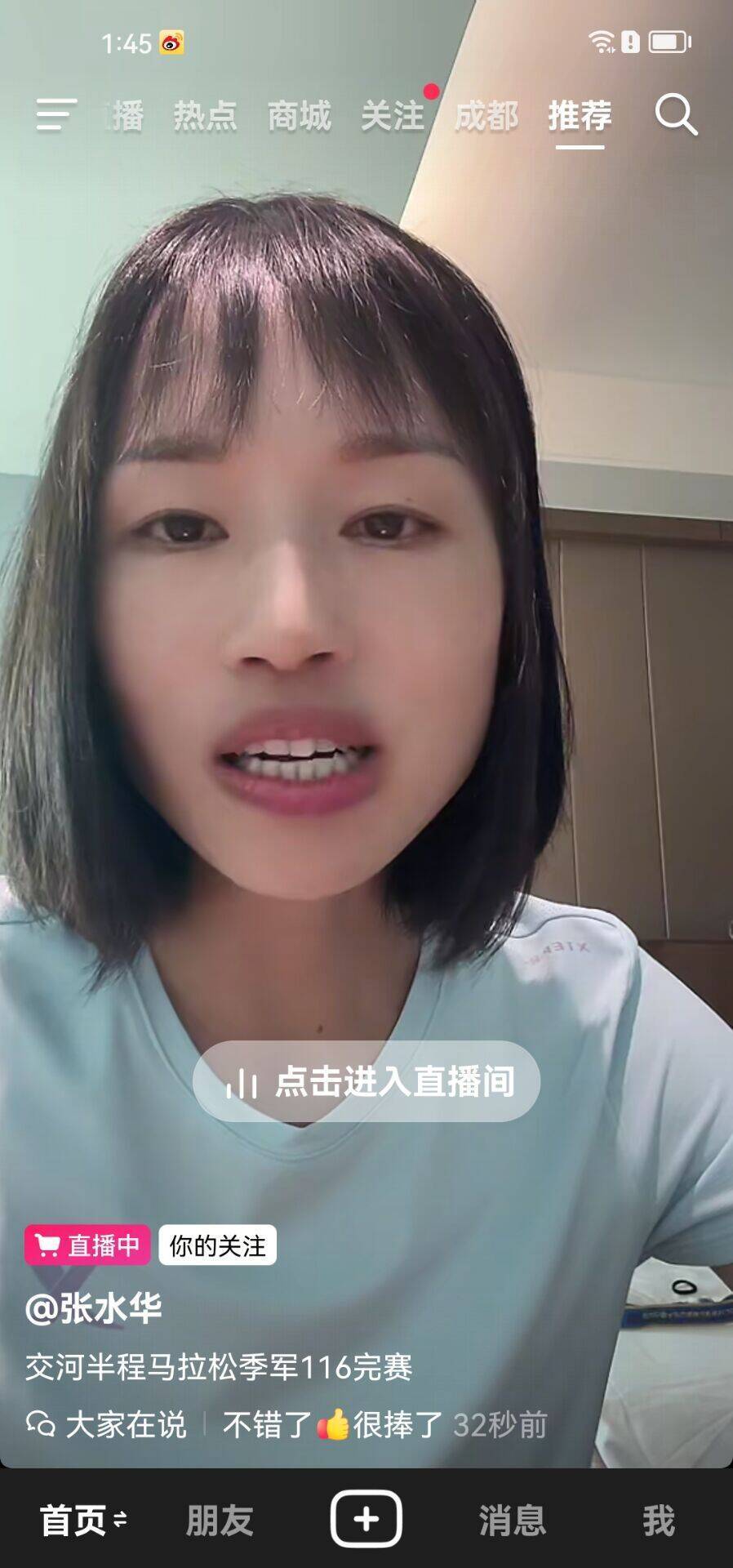 张水华说她以前的半马最好成绩是1小时18分,是疫情结束后那几年跑出来的。今天能跑到1小时16分她感到很满意,已经刷新个人最好成绩了。今天这场比赛直播间有4万观众围观,张水华说跑不动的时候想到那么多人在看着自己跑,于是就坚持跑下来了。