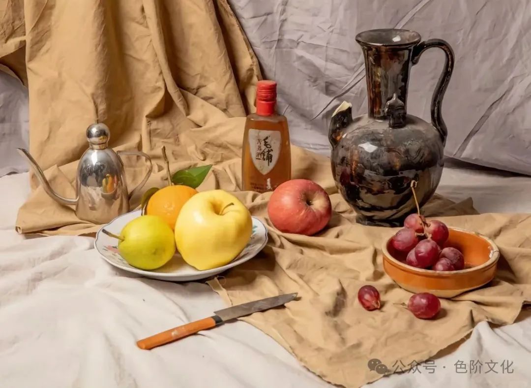 搜索关键词:黄色调色彩静物组合水粉画,深色花瓶罐子酒瓶盘子苹果梨子葡萄陶碗水果刀,静物色彩横构图,静物色彩照片对画,黄色调静物色彩组合,小红书:380681446,来源神醒色彩