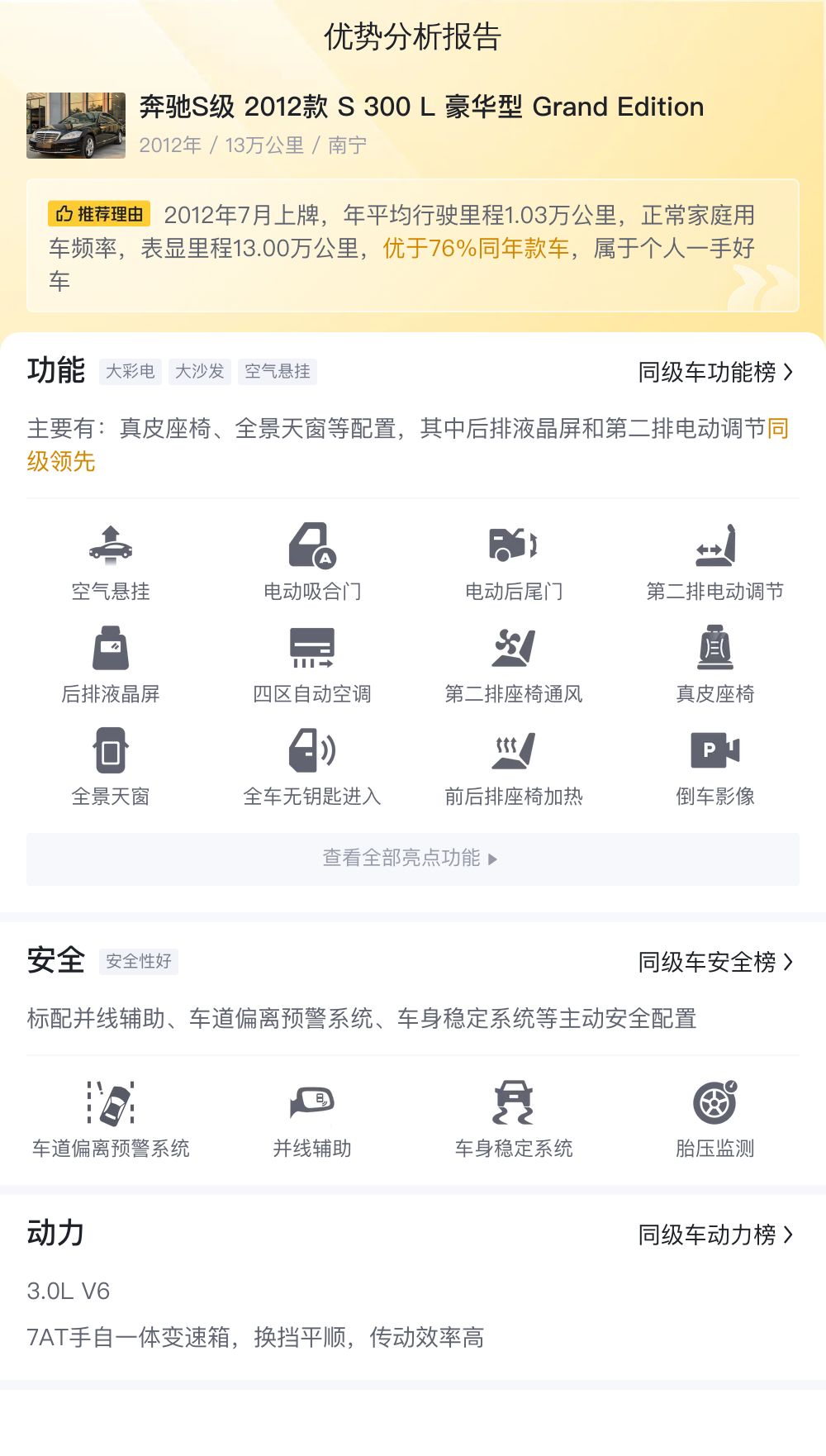 这辆二手奔驰S级的具体版本是——奔驰S级 2012款 S 300 L 豪华型 Grand Edition,这辆车的定位是大型轿车,采用了黑色车身配色,上牌地为南宁,上牌日期2012年7月,表显里程13万公里,排放标准为欧IV,新车指导价110.8万,二手车报价11.68万,未过户。